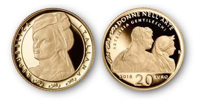 La moneta in oro, dal valore nominale di 20 euro, ha il volto di Artemisia Gentileschi, icona dell'affermazione e del talento femminile, le cui opere sono un viaggio nell'arte barocca del XVII secolo. È disegnata dall'artista incisore Maria Angela Cassol; la tiratura è di 1.200 pezzi per la versione proof.
