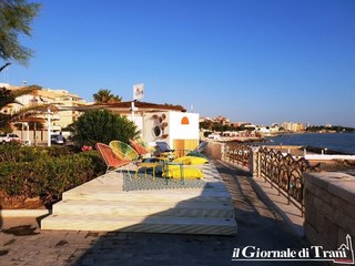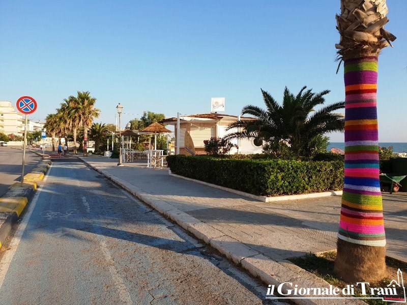 Due palme sono state cinte da un tessuto multi colorato che sembra evocare luoghi di mare particolarmente lontani, ma il cui spirito vorrebbe essere trapiantato in questo segmento di litorale cittadino, anche grazie all'arredo della nuova attività di ristorazione sorta presso il chiosco comunale denominato Ottagono.