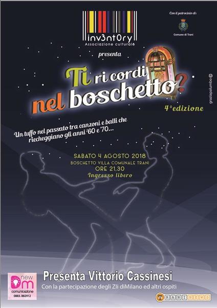 Sabato 4 agosto alle 21.30 nell’anfiteatro del boschetto della villa comunale di Trani Vittorio Cassinesi presenta: “Ti ricordi nel boschetto?”. L’evento è un tuffo nel passato con canzoni e balli che riecheggiano gli anni ‘60 e ‘70. Con la partecipazione di Donato di Leo, gli Zii di Milano e altri ospiti. Ingresso libero. Per info e contatti: 3476215614.