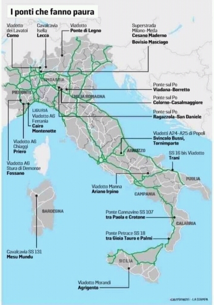Ed è un consigliere comunale di Trani, Raimondo Lima, a inviarci una mappa e una nota: «Questo grafico che vi allego (in foto, ndr) è stato mostrato a Studio Aperto. Tra “i ponti che fanno paura” pare ci sia un non specificato “viadotto della 16bis” nella nostra Trani. In qualità di consigliere comunale, chiederò formalmente al sindaco e a chi di competenza di verificare la veridicità di questo grafico e di chiedere nell’immediato di relazionarci in Aula. Sulla pubblica sicurezza non si scherza».