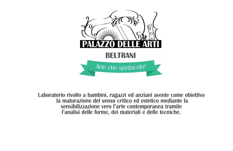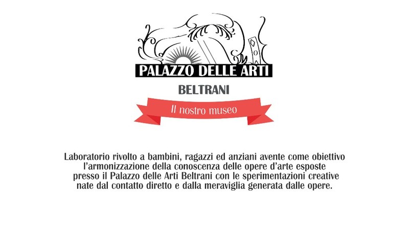 Sono iniziati martedì 21 agosto presso il palazzo delle arti Beltrani degli incontri laboratoriali. Tali piacevoli esperienze prevedono tre percorsi diversi, ognuno dei quali è fruibile in orari prestabiliti e distintamente, senza alcun vincolo o obbligo di frequenza. Tutti i laboratori sono aperti sia ai ragazzi dai 6 ai 15 anni che agli over 65.