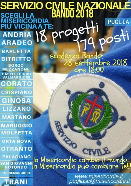 È stato attivato il bando per la selezione di 53.363 volontari da impiegare in progetti di Servizio civile in Italia ed all’estero. In particolare in Puglia saranno 1.331 i volontari da selezionare e di questi 179 saranno ospitati nelle Confraternite di Misericordia di Puglia. È assoluto record per le associazioni della Federazione pugliese, assieme in ben 18 progetti approvati dal Ministero per 19 Misericordie che ospiteranno per un intero anno giovani e giovanissimi.
