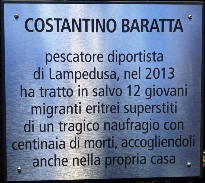 Costantino Baratta, 61enne muratore tranese, da 31 anni residente a Lampedusa, il 3 ottobre 2013 salvò la vita a dodici persone durante il naufragio di un barcone di profughi diretto verso l’Italia. In quella tragedia del mare e della disperazione morirono 368 persone e, da allora, il 3 ottobre è la Giornata nazionale in memoria delle vittime dell'immigrazione.