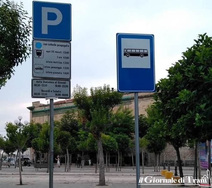 Sosta a pagamento per le auto o per i bus? O tutte e due? non è ancora ben chiaro a cosa sia destinata la porzione di piazza Plebiscito nella quale convivono due stalli con strisce blu ed uno, con gialle, per la sosta dei pullman. Pitture e cartelli appaiono conflittuali fra loro, ed il risultato è che chi si presenta prima si prende il posto.
