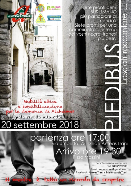 L’associazione Anteas Trani, in rete con l’associazione Misericordia di Trani, al fine di promuovere la mobilità attiva definita come uno dei fattori protettivi legati alle patologie neurodegenerative e per sensibilizzare il territorio in merito al tema relativo alle diverse tipologie di demenza, organizza l’evento che rientra nel progetto di Piedibus, strutturato con l'aiuto della dottoressa Erminia Battista, dirigente medico presso l'Asl di Perugia e fondatrice del “Piedibus del benessere”.