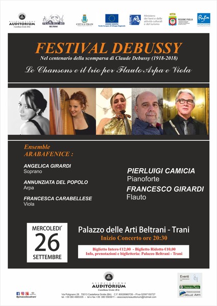 Mercoledì 26 settembre alle 20.30 presso palazzo Beltrani, nell’omonima via, si terrà un altro appuntamento del Festival Debussy, a cura dell’associazione Auditorium di Castellana Grotte.