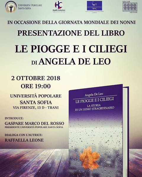 In occasione della Giornata mondiale dei nonni, l’Università Popolare Santa Sofia martedì 2 ottobre, presso la sua sede in via Firenze 13/D, nella biblioteca intitolata a Savino Giannella, terrà la presentazione del libro della scrittrice Angela de Leo “Le piogge e i ciliegi”. Appuntamento alle 19. La scrittrice leggerà i passi più belli del suo libro, accompagnata dal sottofondo musicale di una chitarra. Introduce Gaspare Marco Del Rosso, presidente Università popolare Santa Sofia. Dialoga con l’autrice, Raffaella Leone.