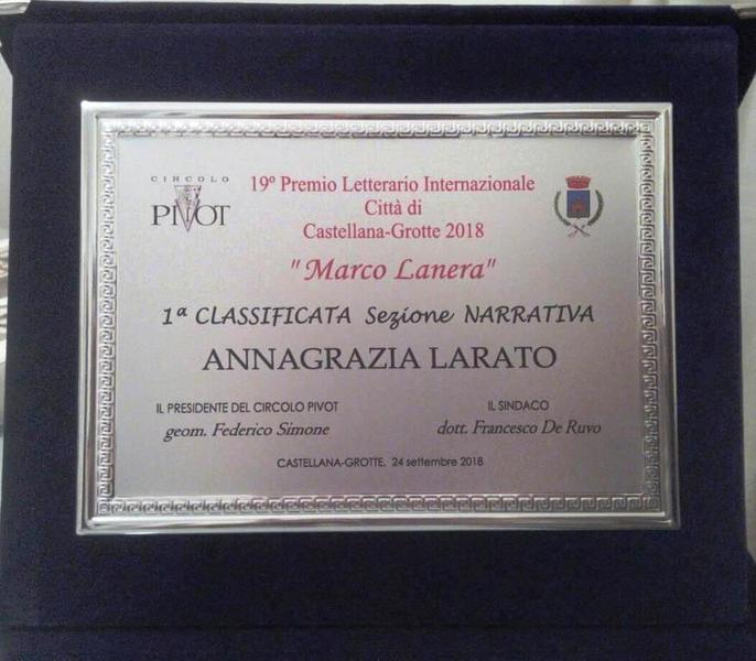 Anna Larato, di Trani, si è aggiudicata il premio letterario internazionale “Marco Lanera”, della città di Castellana Grotte - sezione Narrativa. Larato ha vinto con il suo racconto “Le tre valigie”, dedicato a suo padre, deceduto pochi mesi fa, scritto proprio mentre era accanto a lui, nella stanza di un ospedale.