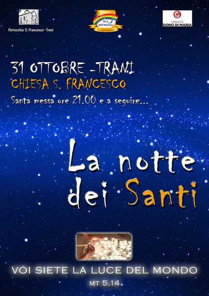 La Parrocchia S. Francesco d'Assisi di Trani, in collaborazione con la Comunità “Arca dell'Alleanza” e la Comunità “Dono di Maria”, oggi 31 ottobre, organizza" La notte dei Santi", con il seguente programma: ore 21.00, celebrazione della santa messa e a seguire “La notte dei santi” sul tema “ ‘Voi siete la luce del mondo’ Mt 5,14”.
