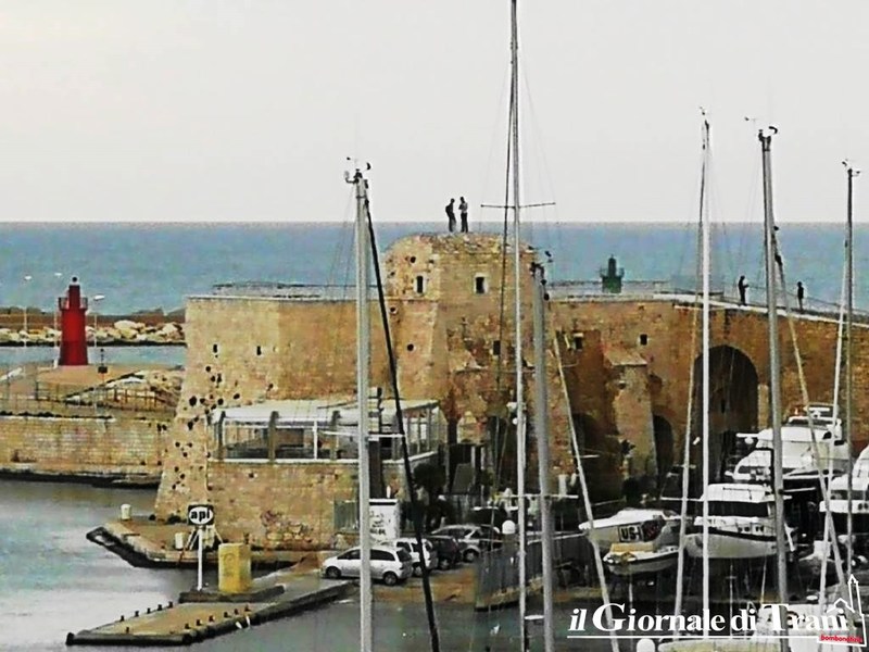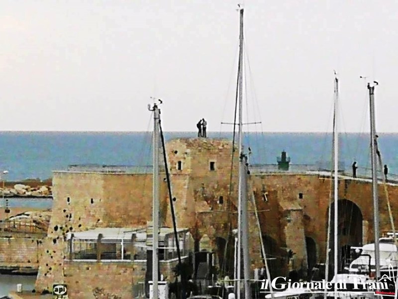 Stiamo parlando delle foto, giunte al nostro numero Whatsapp 3738720314, di due persone pericolosamente salite sulla sommità del torrino del fortino della villa comunale di Trani.