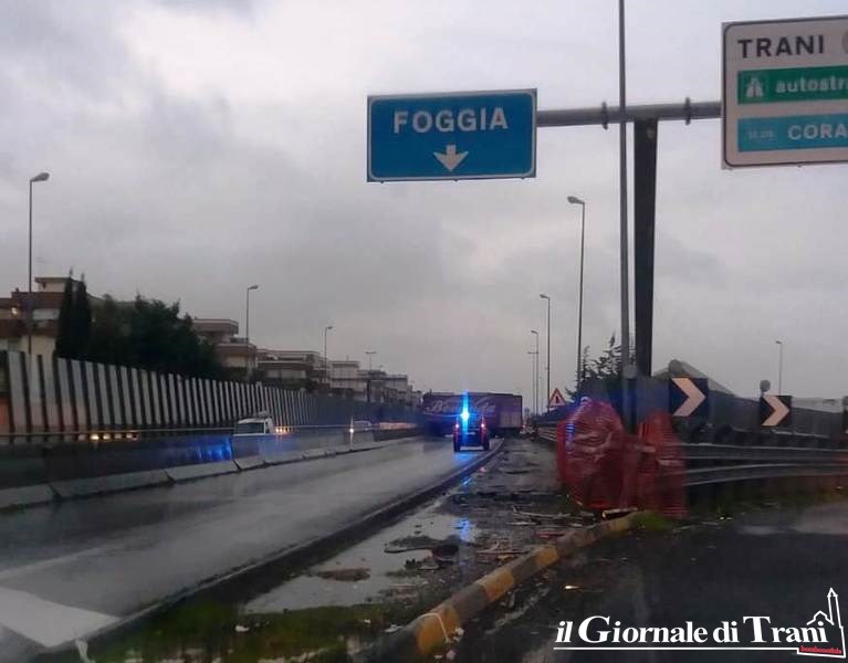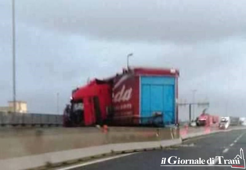 La strada statale 16 bis, in direzione Foggia, poco dopo l'uscita Trani centro, è bloccata a causa dell'incidente accaduto ad un tir intorno alle 15.30. Per cause ancora da accertarsi, il mezzo pesante è finito di traverso occupando l'intera carreggiata e facendo anche cadere pezzi dicordolo e calcinacci sulla strada sottostante.