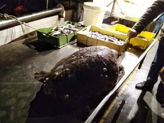 Pure in questa occasione, così come nella precedente, nell'attesa del recupero, l'animale è rimasto in esposizione, nel vero senso della parola, sul banco vendita dei pescatori lungo la banchina del porto, davanti alla poppa del peschereccio, anche a disposizione delle foto ricordo per i bambini, come la piccola Camilla, che porterà sempre con sé questo bellissimo ricordo.