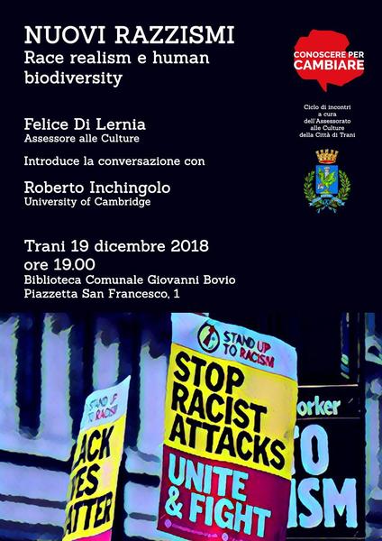 “Nuovi razzismi – Race realism e human biodiversity” è il terzo appuntamento della nuova stagione del ciclo di incontri “Conoscere per cambiare” ideato dall’Assessorato alle culture della Città di Trani.