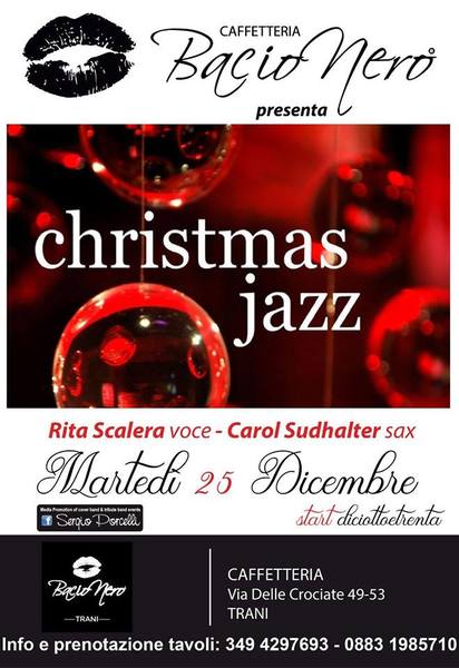Martedì 25 dicembre dalle 18.30 alle 20.30 presso la caffetteria Bacio Nero Trani, in via delle Crociate 49-53, "Christmas jazz", serata con Carol Sudhalter al sax e Rita Scalera alla voce.