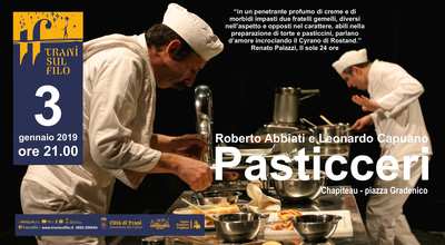 Due fratelli gemelli. Uno ha i baffi l’altro no, uno balbetta l’altro no, parla bello sciolto. Uno crede che la crema pasticciera sia delicata, meravigliosa e bionda come una donna, l’altro conosce la poesia, i poeti, i loro versi e li dice come chi non ha altro modo per parlare. Sono i Pasticceri Roberto Abbiati e Leonardo Capuano (già protagonista lo scorso anno dello spettacolo vincitore del più importante premio teatrale italiano, l’Ubu 2018) che abiteranno lo chapiteau di “Trani sul filo”, giovedì 3 gennaio alle 21, in piazza Gradenigo.
