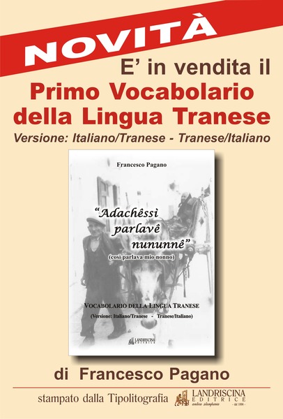 È stato pubblicato il primo vocabolario della lingua tranese, versione italiano / tranese – tranese / italiano, a cura di Francesco Pagano, edizioni Landriscina. Il volume è acquistabile presso le edicole Ulisse (piazza della Repubblica) e Di Ronzo (via Mario Pagano).