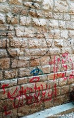 Dopo la cattedrale, San Toma: altre scritte rosse, e non solo, sulla parete a sinistra della chiesa per chi guarda l'ingresso.