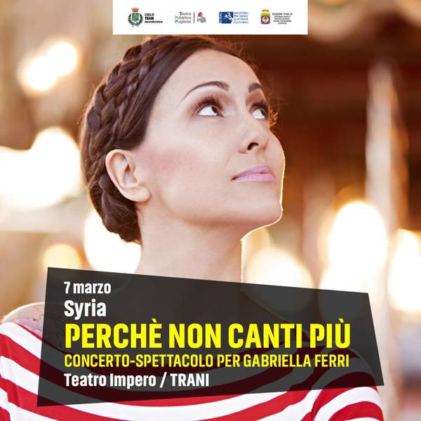 Giovedì 7 marzo alle 21 (porta ore 20.30) al cinema teatro Impero di Trani, in via Mario Pagano 192, terzo appuntamento della stagione di prosa con “Perché non canti più”, con Syria.