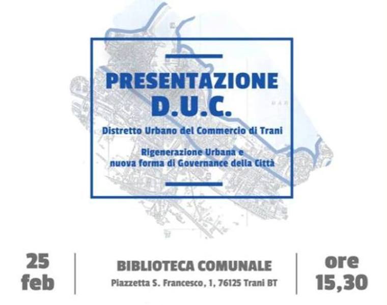 Domani, lunedì 25 febbraio, alle 15.30 presso la biblioteca comunale Giovanni Bovio, in piazzetta San Francesco, si terrà la presentazione ufficiale del Distretto urbano del commercio di Trani. Alla presenza di cittadini, commercianti e rappresentanti del Comune di Trani, si presenteranno opportunità e vantaggi di un nuovo modo di pensare e concepire il commercio urbano in sinergia con le attività turistiche della città.