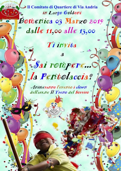 “Semel in anno licet insanire”: è con questa allocuzione che i romani giustificavano i baccanali, antitesi dell’odierno Carnevale, e che noi del Comitato di quartiere di via Andria ricorderemo domenica 3 marzo dalle 11.00 alle 13.00 in largo Goldoni (foto 1). Ad animare l’evento ci saranno i clown del “Treno del sorriso”.