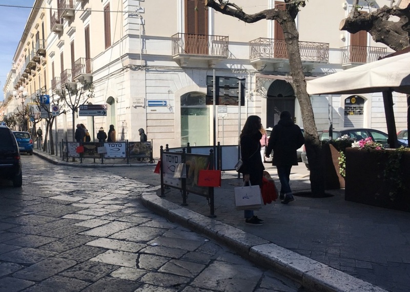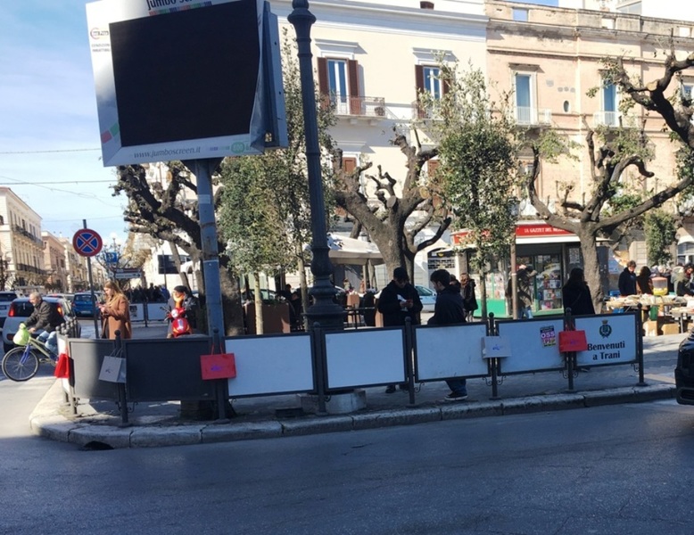 Oggi, in zona centro, Trani si è ritrovata letteralmente invasa da shoppers di carta posizionate qua e là per le affollate vie del centro.