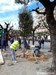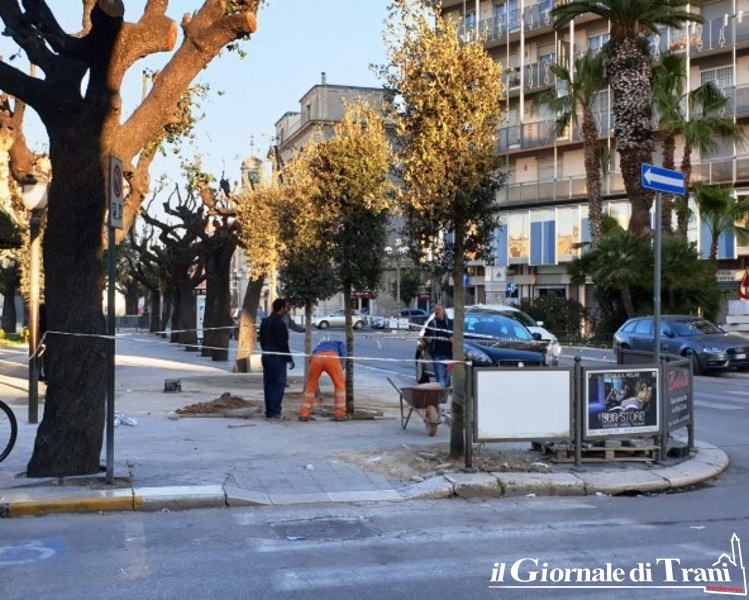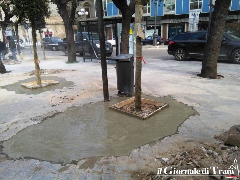 I lavori si stanno concludendo con la realizzazione degli alloggiamenti ed il rifacimento delle zone di pavimentazione interessate, il cui costo fa parte di quello unitario di ogni nuovo leccio.
