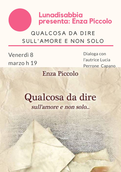 La libreria Luna di sabbia, in via Mario Pagano 192, in collaborazione con "Società Dante Alighieri" Comitato di Trani e Fidapa Trani organizza la presentazione del libro “Qualcosa da dire sull’amore e non solo”, di Enza Piccolo, che si terrà presso la libreria Luna di sabbia venerdì 8 marzo alle 19.