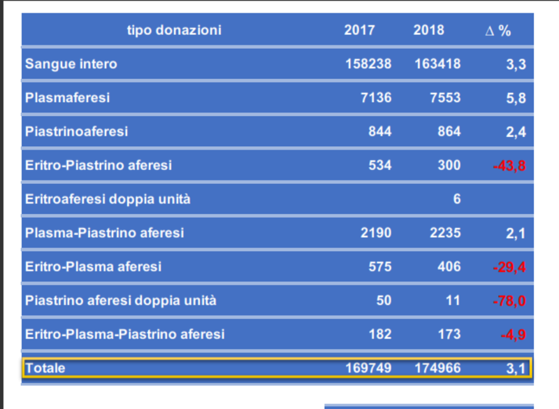 Le donazioni di sangue ed emoderivati nel 2018 sono state 174.966, registrando un incremento del 3,1% rispetto al 2017, quando sono state 169.749.