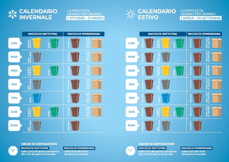 Il calendario di raccolta porta a porta estivo (1 aprile - 30 settembre) per le utenze non domestiche prevede l’esposizione dei contenitori per il conferimento dei rifiuti dalle ore 21 del giorno precedente la raccolta alle ore 02 del giorno di raccolta per le frazioni: organico, plastica e metalli, vetro, carta e non riciclabile. La raccolta pomeridiana riguarderà la frazione organico e imballaggi di cartone con esposizione delle attrezzature dalle 15 alle 16 del giorno di raccolta. Si evidenzia che nel calendario estivo la raccolta della frazione organico è prevista due volte al giorno.