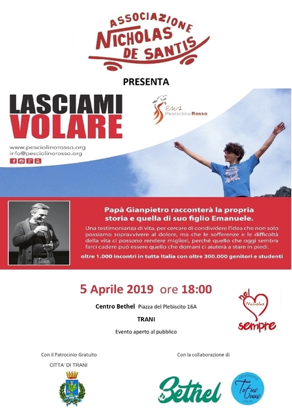 Venerdì 5 aprile, alle 18, presso il centro Bethel, in piazza Plebiscito 16, l'associazione Nicholas de Santis presenta l’evento "Lasciami volare", a cura della fondazione Ema-Pesciolino rosso. Interverrà Gianpietro Ghidini, meglio conosciuto come «Papà Gianpietro», che tenuto oltre mille incontri, in tutta Italia, per portare ovunque la sfortunata storia di suo figlio, Emanuele, e sostenere i giovani in attività di sano sviluppo e crescita sociale.