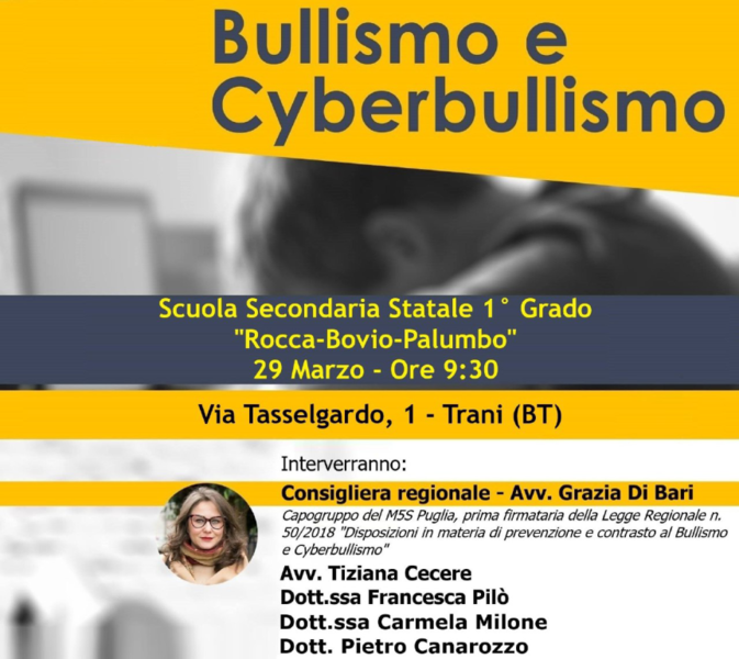 Venerdi 29 marzo alle 9.30 presso la Scuola Secondaria Statale 1° Grado "Rocca-Bovio-Palumbo" a Trani avverrà un incontro dal titolo "Bullismo e cyberllismo".