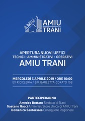 L’amministratore unico di Amiu Trani Gaetano Nacci commenta così l’apertura dei nuovi uffici attivi dallo scorso 18 marzo 2019: «Il trasferimento si è reso necessario in virtù delle condizioni della sede di via Barletta, 161 non più idonee ad ospitare una realtà aziendale come Amiu Trani. Operare in spazi più adeguati inciderà in maniera positiva sulla qualità del lavoro delle lavoratrici e dei lavoratori e favorirà il miglioramento dei servizi erogati dall’azienda alla cittadinanza. Con l’amministrazione comunale ci siamo dati obiettivi ambiziosi che perseguiamo con passione e tenacia tra i quali rientra l’avvio della raccolta differenziata porta a porta per tutte le utenze e sull’intero territorio comunale. Incoraggiante in tal senso la risposta delle utenze non domestiche food rispetto al sistema di raccolta porta a porta avviato il 18 marzo 2019. Siamo convinti che, su impulso dell’amministrazione comunale e con la collaborazione dei cittadini, sarà possibile a breve tagliare traguardi prestigiosi per la città di Trani».