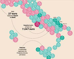 Il sole 24 ore ha pubblicato la mappa completa del pagamento dell'Irpef, Imposta sul reddito delle persone fisiche, in tutta Italia. I dati vengono ricavati dalle tabelle diffuse dal Dipartimento delle finanze, che conferma i problemi dell’Italia fiscale, e cioè un’ampia forbice tra il Nord e il Sud. A Milano, una delle città più ricche, il reddito medio si ferma a 32.646 euro, e l’Irpef è pari a 11.271 euro. La nostra provincia viene considerata “cenerentola” perché vengono dichiarati i redditi più bassi: a Trani, il valore è di 4.694 euro, con una percentuale del 28,1 per cento.