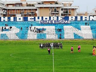 L'emozione più bella di Trani-Mesagne arriva prima della partita, con il riconoscimento che la società offre a Giuliano Biggi, 82 anni, portiere del grande Trani promosso in serie B. Gli applausi per lui sono pari a quelli per i soli giocatori e staff tecnico, in favore dei quali compare un «Grazie ragazzi» al centro di una gradinata pressoché deserta.