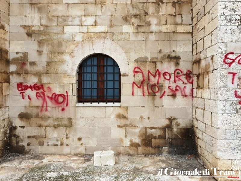 Il forte vento delle ultime settimane lo ha fatto cadere, tornando a mostrare l'imbarazzante sequenza di scritte rosse su pietra di Trani bianca.