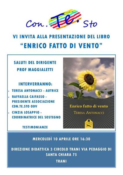 Mercoledì10 aprile alle 16,30 presso la direzione didattica del III circolo, in via pedaggio di Santa Chiara 75 (scuola D'Annunzio), l'associazione con.Te.Sto onlus presenta il libro "Enrico fatto di vento" della scrittrice e