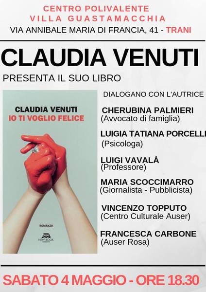 La scrittrice Claudia Venuti presenterà sabato 4 maggio il suo nuovo libro “Io ti voglio felice”. La location scelta per questa presentazione è il centro polivalente Villa Guastamacchia di Trani che, a partire dalle ore 18.30, accoglierà lettori, curiosi e i tanti che si sono appassionati alle storie di Mia. Infatti, quest’ultimo libro conclude una trilogia iniziata con “Passi di mia” e continuata con “Dove ti trovo”. «Questo nuovo libro va a chiudere un percorso iniziato tre anni fa - ha affermato Claudia Venuti - quando Mia ha mosso i primi passi ed io con lei. Arrivare alla fine di qualcosa lascia sempre un filo di tristezza, ma allo stesso tempo anche la possibilità di ripartire con nuove pagine da scrivere. In questo terzo capitolo della saga - continua la giovane scrittrice - c’è una nuova Mia, consapevole di ciò che desidera per se stessa. Una donna forte e decisa come non mai pronta a lottare per il proprio sogno”.