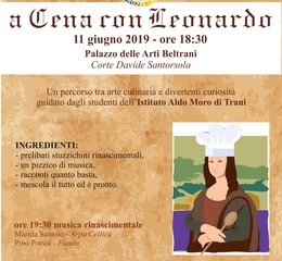 Martedì 11 giugno, a partire dalle ore 18.30, si terrà l’incontro “A cena con Leonardo”. L’evento, che fa parte di un più ampio ciclo di approfondimenti culturali, incentrati sulle attività del territorio di Trani negli anni di Leonardo in particolare con usi, costumi, lingua parlata, architettura, scienza e cultura in generale, è focalizzato sulla cultura culinaria. Attraverso la rielaborazione di alcune ricette scritte da Leonardo, tratte dal Codex Romanoff, i ragazzi dell’Istituto Aldo Moro prepareranno dal vivo le pietanze con l’intento di svelare un aspetto inconsueto ed inedito del Genio spaziando tra arte culinaria e divertenti curiosità. Le attività, supervisionate e coordinate dall’Archeologo Giuseppe Ruggiero, sono state seguite dal Dirigente dell’Istituto scolastico Aldo Moro, il Prof. Michele Buonvino, e dai docenti Emiliana Buono, Vincenzo Conversano, Anna Di Pasquale, Giovanni Landriscina, Federica Paradiso e Marida Sannito.