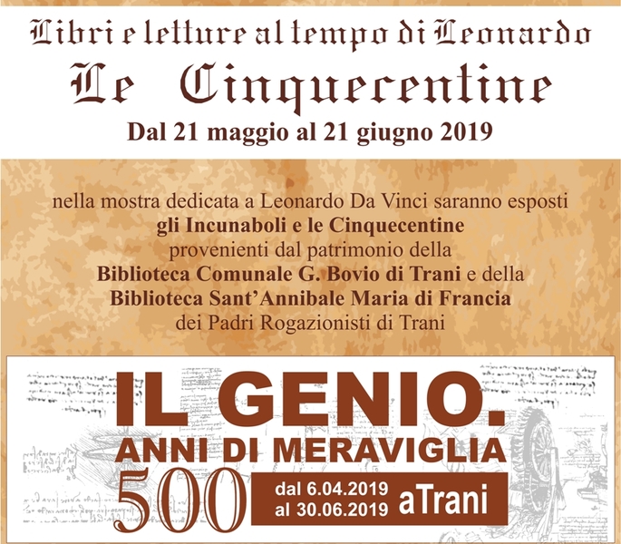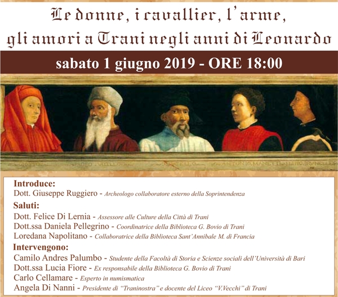 Per il mese di giugno, a palazzo Beltrani, sono previsti numerosi appuntamenti, eventi collaterali nell’ambito del progetto “Il genio. 500 anni di meraviglia”, realizzati dall’associazione Delle Arti in collaborazione con Creattivamens e con il Centro culturale polifunzionale della città di Trani di Palazzo Beltrani, che gode dei patrocini dell’Assessorato alle Culture della città di Trani, Teatro Pubblico Pugliese, Festival internazionale Castel dei Mondi, Ordini degli Ingegneri e Architetti della BAT, e che vede la partecipazione del Liceo Artistico Federico II Stupor Mundi di Corato, dell’IISS Aldo Moro e del Liceo scientifico statale “Valdemaro Vecchi” di Trani.