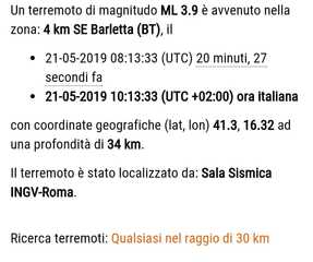 Una forte scossa di terremoto è stata avvertita nel territorio della Bat, alle 10.13, con magnitudo 3,7della scala Richter. Secondo quanto emerge dal rapporto dell'Istituto nazionale di geofisica e vulcanologia, la scossa è stata avvertita nei pressi di Barletta, con latitudine 41.3, longitudine 16.32 e profondità di 34 km.