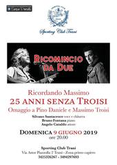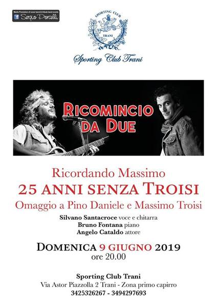 Domenica 9 giugno alle 20.00 allo Sporting club di Trani in via Astor Piazzolla (zona Primo Capirro) si terrà l’evento “Ricomincio da due”. L’evento è organizzato a 25 anni dalla morte di Troisi per omaggiare Massimo e anche un altro napoletano che ci ha lasciato troppo pesto, Pino Daniele.
