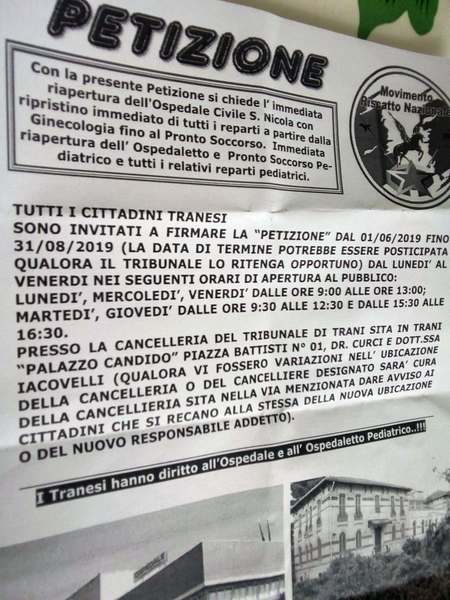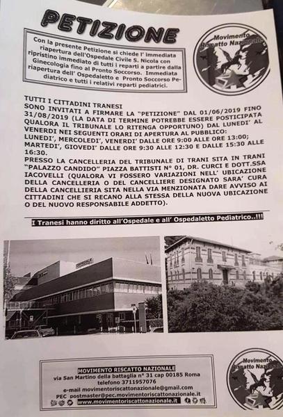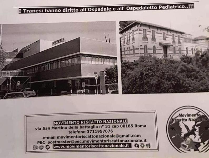 Il Movimento riscatto nazionale torna in scena per invitare i cittadini tranesi a firmare la petizione in favore della riapertura dell'Ospedale civile San Nicola Pellegrino.