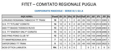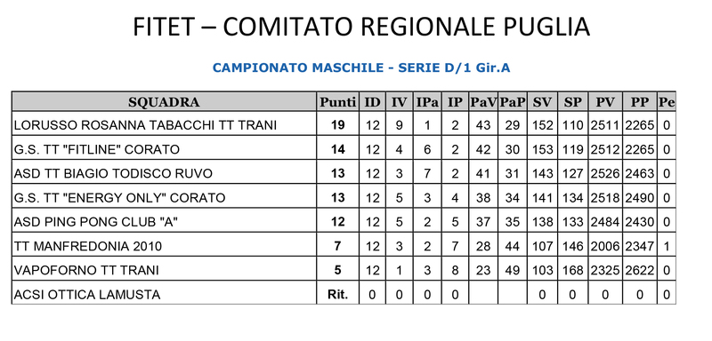 Con rammarico, invece, comunichiamo che la squadra TT Trani "Vapoforno" retrocede al campionato regionale di D/2 per la stagione 2019/2020, ma con la voglia di rifarsi e combattere per il titolo.