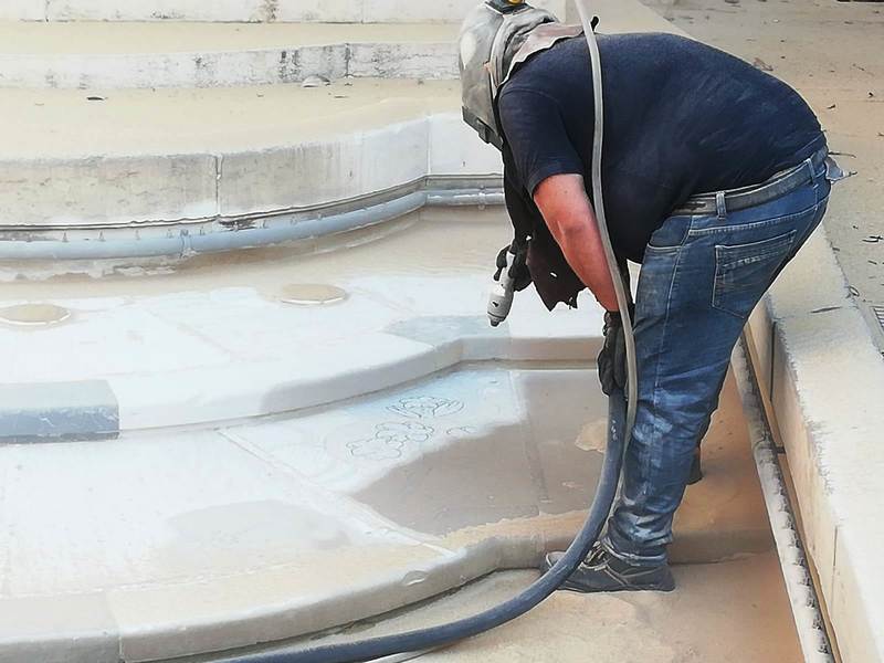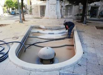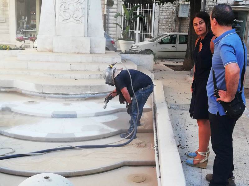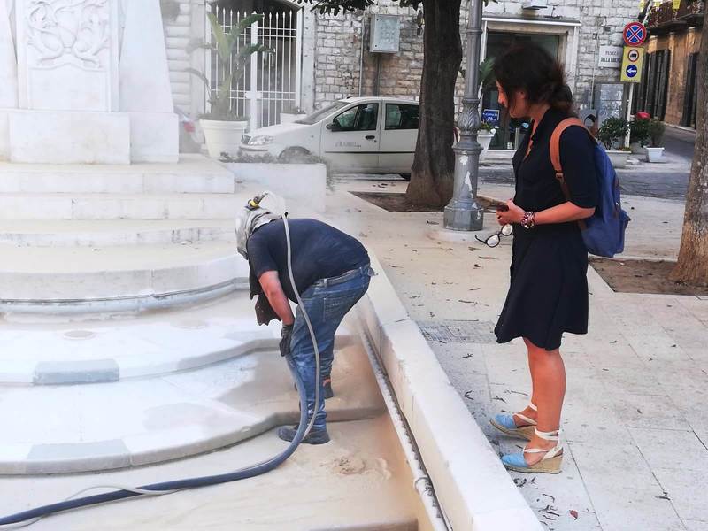 A distanza di molti anni dall'ultima, radicale manutenzione, ieri mattina la fontana ornamentale di piazza Libertà, ai piedi del monumento di Antonio Bassi dedicato alla Madonna Immacolata, è stata oggetto di un intervento di sabbiatura, realizzato da una ditta specializzata in collaborazione con Amiu, che ha ridato splendore alla pietra di Trani di cui quel manufatto è principalmente costituita.