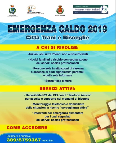 In vista delle ondate di calore che potrebbero verificarsi durante questa stagione estiva, e che potrebbero creare difficoltà a quelle fasce di cittadini particolarmente vulnerabili (principalmente anziani soli o persone sole con patologie particolari) il sindaco della città di Trani, Amedeo Bottaro ed il sindaco della città di Bisceglie, Angelantonio Angarano, hanno presentato in conferenza stampa i servizi di sollievo e sostegno che saranno erogati attraverso il servizio di Ambito di pronto intervento sociale gestito dalla Cooperativa Promozione Sociale e Solidarietà di Trani e coordinato dai servizi sociali professionali di Trani e Bisceglie.