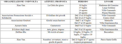 Le attività (alcune già partite) sono state pensate considerando la specificità e la storia dei soggetti attuatori, in modo armonico e nel rispetto delle singole competenze. I bambini (25 presso il centro polivalente per minori ubicato presso il centro Gaia, tutti gli altri inseriti nei vari progetti ludici organizzati) vivranno l’estate in colonie al mare, in attività ludico didattiche fatte per strada e nei progetti storici “Santa Geffa” e “Il Giullare”.