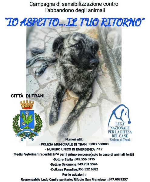 Per le adozioni, si ricorda che il canile sanitario è gestito dalla sezione di Trani della Lega del cane Lndc. Il canile è aperto nei giorni di martedì e sabato dalle ore 16.30 alle ore 18.30 (nel periodo di vigenza dell’ora legale) e negli stessi giorni dalle ore 15 alle ore 17 (nel periodo di vigenza dell’ora solare). Il Comune di Trani non dispone di una propria struttura per il rifugio degli animali. L’Ente si affida alla struttura della Lndc. A tal scopo, è in essere la convenzione con il canile rifugio San Francesco sito in contrada Delle Botti. Il canile rifugio convenzionato con il Comune di Trani è aperto nei giorni di sabato e domenica dalle ore 10 alle ore 12 (info contatto: 347.6089257).