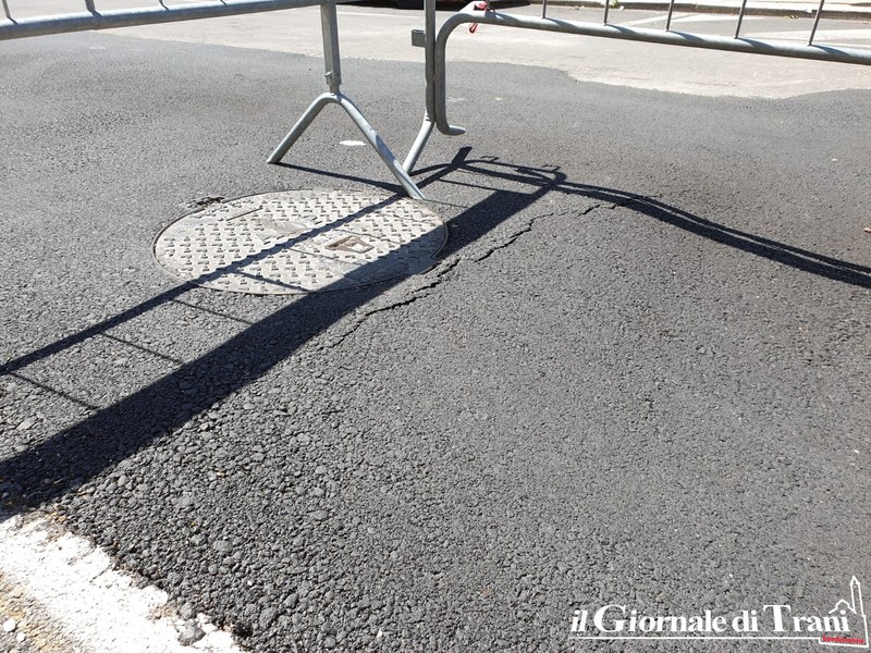 Il ripristino parziale dei lavori compiuti da Acquedotto Pugliese nei giorni scorsi, sul tratto finale del lungomare Chiarelli nei pressi dell'intersezione con piazza Plebiscito, ha ceduto a seguito della forte pioggia di ieri e oggi è delimitato con transenne.