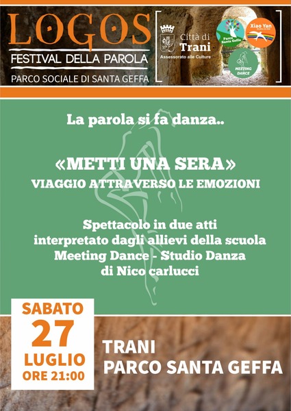 Questa seconda settimana di eventi si conclude sabato 27 Luglio con "Metti una sera", viaggio di danza ed espressività. Si tratta di uno spettacolo in due atti interpretato dagli allievi della scuola Meeting Dance - Studio Danza Trani di Nico Carlucci.