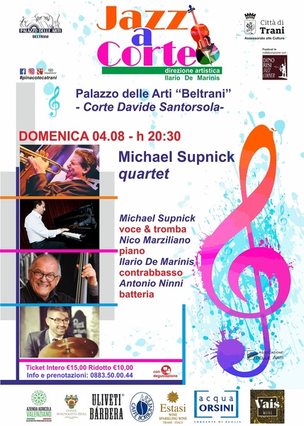 Il Michael Supnick quartet sarà pronto a stupire appassionati ed estimatori del jazz domenica 4 agosto inaugurando il secondo tempo della rassegna “Jazz a Corte” in programma sino a fine settembre per tutta un’estate a suon di jazz! Un cartellone che gode del patrocinio del comune di Trani, pensato dal direttore artistico De Marinis come prosecuzione naturale, in una sede di prestigio come Palazzo Beltrani, dell'attività di divulgazione del jazz e dello swing intrapresa durante il periodo invernale dal Dino Risi Jazz Corner di Trani.